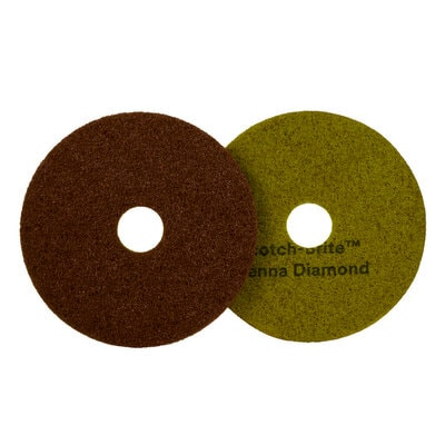 Scotch-Brite™ Diamant Maschinenpads, Ocker, sind für Böden mit mittlerem Glanz und in einem guten Ausgangszustand vorgesehen. Ideal zum Reinigen und Polieren von abgetretenen oder stumpfen Marmor-, Terrazzo-, Vinyl-, Schiefer- oder polierten Betonböden. Reinigen und polieren Böden bis zu einem mittleren Glanz – ohne den Einsatz von Reinigungsmitteln. Das Scotch-Brite™ Diamant Maschinenpad, Violett, kann dazu eingesetzt werden, das Erscheinungsbild weiter zu verbessern. Hochwertiges Maschinenpad bestehend aus Polyesterfaser mit Diamant Schleifkorn. Zum Vorschleifen bei stark beanspruchten kalkgebundenen Steinoberfläche.