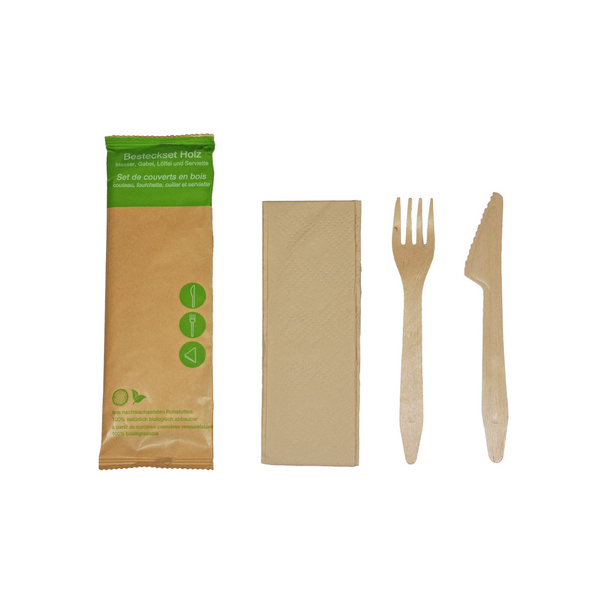 In Kraftpapier verpacktes Besteckset bestehend aus einer Holzgabel, einem Holzmesser und einer 2-lagigen Serviette. Masse Serviette: 32 × 32 cm, 1/12-Falzung.