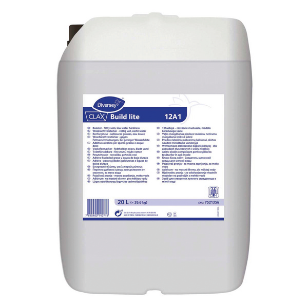 Clax Build lite ist ein hochkonzentrierter, alkalischer, flüssiger Waschkraftverstärker. Durch die Reduzierung des Zusammenhaltens von Schmutz und Fasern verbessert sich die Reinigungswirkung und verhindert die Vergrauung von weisser Wäsche.