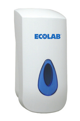 Manueller Schaumseifenspender in Weiß mit Silikon-Pumpe von Ecolab, ideal für hygienische, kontrollierte Seifenausgabe in professionellen oder öffentlichen Waschräumen.
