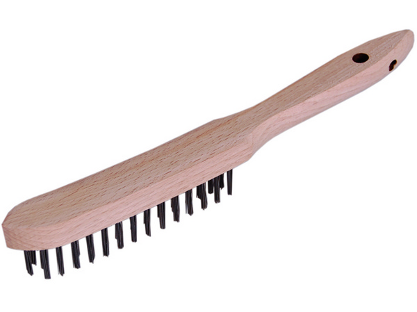 Die Drahtbürste ist dreireihig und verfügt über einen Holzgriff.