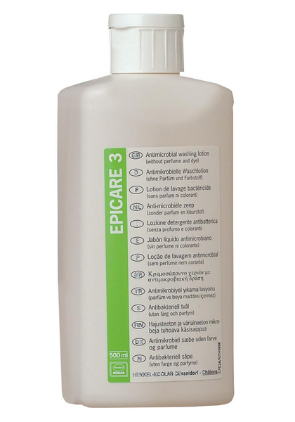 Epicare 3 eignet sich hervorragend für die hygienische Händereinigung in Lebensmittel verarbeitenden Bereichen, z. B. in Küchen bei wechselnden Arbeiten von der unreinen zur reinen Seite oder in Sanitärräumen. Epicare 3 ist parfüm- und farbstofffrei.