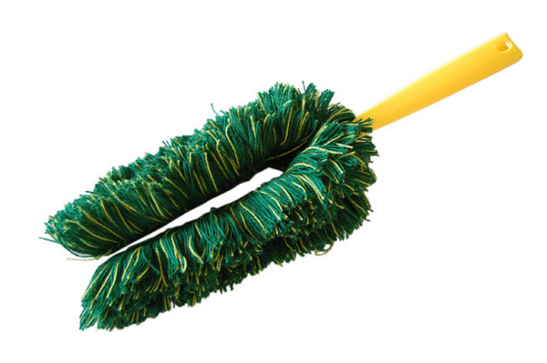 Der Gabelflaumer hat einen Kunststoffgriff und sein Besatz besteht aus Baumwolle. Er kann vielerorts effizient eingesetzt werden.