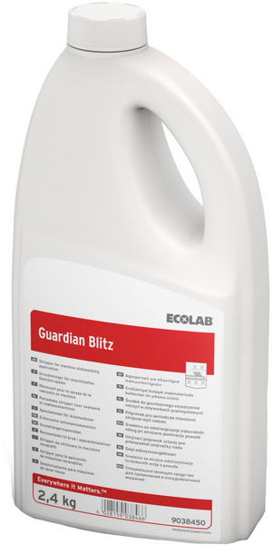 Guardian Blitz zur bedarfsweisen Grundreinigung von alkalifestem Spülgut in gewerblichen Geschirrwaschmaschinen. Nicht geeignet für alkaliempfindliche Materialien wie z. B. Aluminium, sowie für Suppentassen mit Kunststoff-/Silikonfugen. Nicht für die manuelle Tauchreinigung (ätzend).