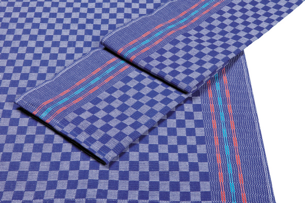 Zwirnhalbleinen, 50 × 85 cm, 110 g/Stück, 4-seitig gesäumt, 2 Aufhänger, kariert, 95°C waschbar, blau