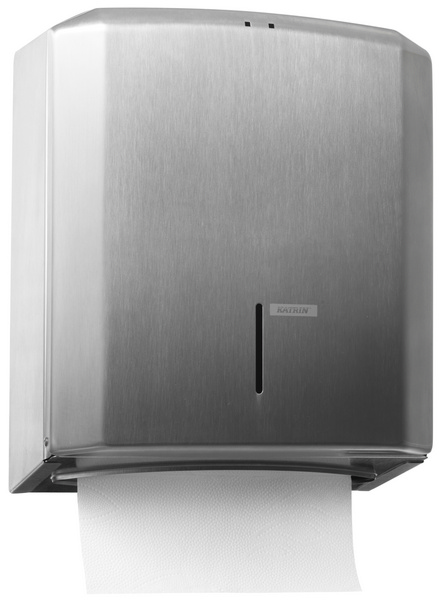 Der elegante Handtuchspender aus gebürstetem Edelstahl wertet jeden Waschraum auf. Das integrierte Sichtfenster zeigt an, wann Handtücher nachgefüllt werden müssen.