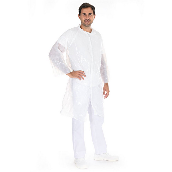Dieser Besucherkittel ist sehr strapazierfähig, feuchtigkeitsundurchlässig und bietet ein angenehmes Tragegefühl. Verschlossen wird er mit stabilen Druckknöpfen.