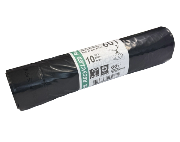 60 Liter, LD-PE Postindustrial Recycling, schwarz, Swiss Made, 570 × 860 mm, 0,038 mm, Rolle à 10 Säcke