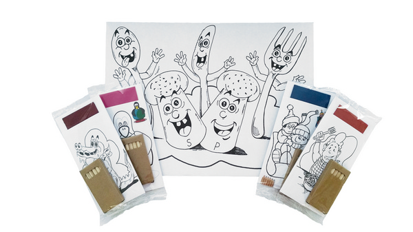 Das Kindermalset besteht aus kinderfreundliche designten 100 Bestecktaschen, 100 Tischsets und 6 verschieden farbige Farbstifte. Durch das Kindermalset können sich die Kinder ruhig künstlerisch entfalten. Durch das Kindermalset werden Erwachsene während dem Essen nicht gestört und die Kinder haben eine Beschäftigung.