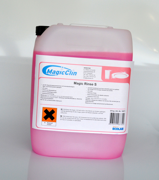 MAGIC RINSES ist ein Glanztrocknungsmittel. Über ein Glanztrocknungs-dosiergerät in das Spülwasser der Geschirrwaschmaschine dosieren. Die jeweilige Verbrauchsmenge wird durch Wasserbeschaffenheit, Maschinentyp, Geschirrart usw. beeinflusst.
