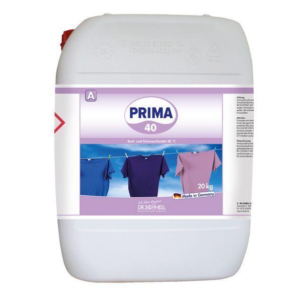 Prima 40 ist ein flüssiges Bunt- und Feinwaschmittel zur schonenden Nassreinigung empfindlicher Textilien. Ideal für die Aufbereitung von temperaturempfindlicher Bewohnerwäsche aus Alten- und Pflegeheimen geeignet, da bereits sehr gute Waschwirkung bei geringen Temperaturen (40 °C). Für bunte und weisse Oberbekleidung und Feinwäsche, da frei von Bleichmitteln und optischen Aufhellern (nicht für Wolle und Seide geeignet).