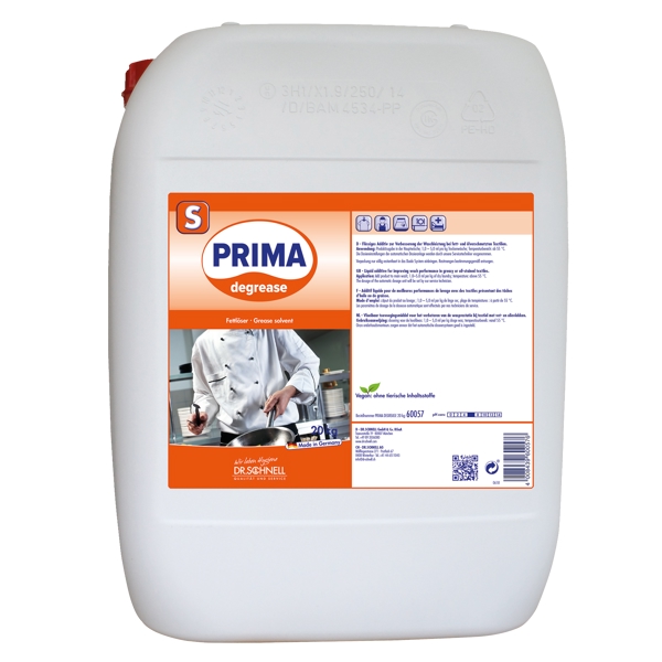 PRIMA Degrease ist ein flüssiger Fettlöser-Additiv zur Reinigungsverstärkung von fett- und ölverschmutzten Textilien.
