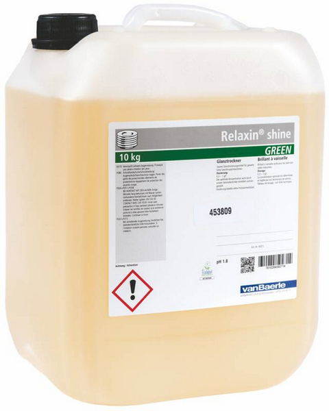 Relaxin shine ist ein nach neusten ökologischen Vorgaben formulierter, saurer Glanztrockner. Er zeichnet sich durch streifenfreien Glanz und schnelle Trocknung auf Geschirr, Besteck und Gläser aus.