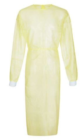 Das Vorderteil und die Ärmel bestehen aus einem Material, das nach EN 14126 gegen Penetration von Bakterien und Viren getestet wurde. Das Rückenteil besteht aus dünnem und luftdurchlässigem Vliesstoff. Der Kittel hat die Öffnung auf der Rückseite, zum Schliessen zwei Bindebänder am Kragen und zwei Bindegürtel, sowie gestrickte Ärmelbündchen.