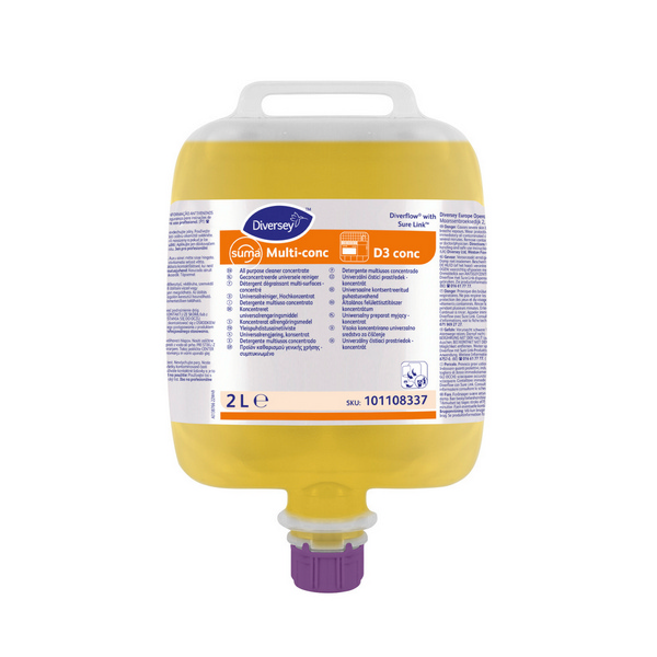 Suma Multi-conc D3 ist ein hochkonzentrierte Reinigungslösung zum Säubern harter Oberflächen - wie Böden, Türen, Decken und Vorrichtungen allgemeiner Art - in Lebensmittel verarbeitenden Bereichen. Durch das optimale Verhältnis zwischen anionischen, nicht-ioinischen Tensiden und Alkalibasen lassen sich damit wirkungsvoll Fette lösen und angetrocknete Speisereste entfernen. Aufgrund des in der Rezeptur enthaltenen Komplexbildners, der die Reinigungswirkung unterstützt, eignet sich das Mittel für alle Wasserbedingungen.
