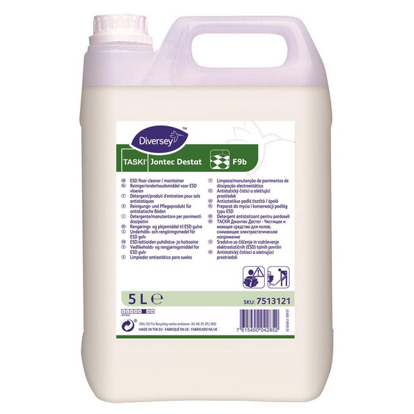 TASKI Jontec Destat ist ein pflegendes Reinigungsmittel für leitfähige Böden. Das Reinigungsprodukt verringert das Risiko von elektrischer Entladungen und erhöht die antistatischen Eigenschaften zugleich.
