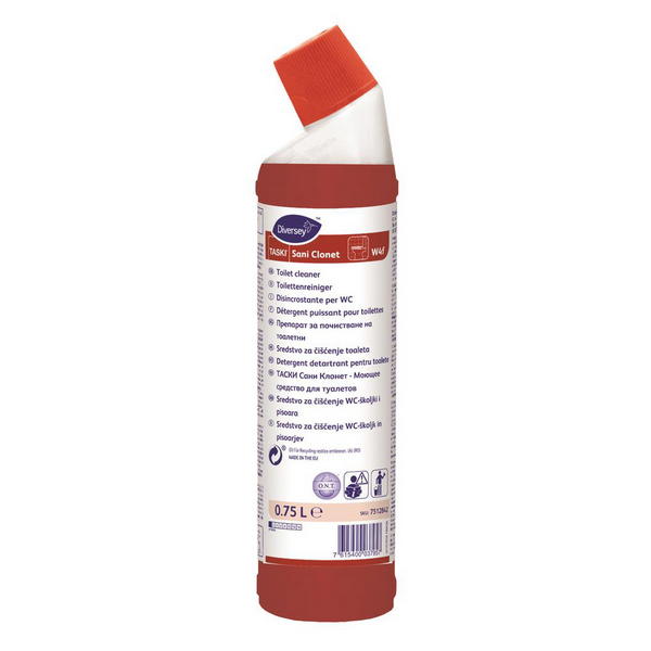 TASKI Sani Clonet ist ein Reiniger für WC-Schüsseln und Pissoiranlagen. Er entfernt effizient und mühelos Kalkansätze sowie andere Rückstände.