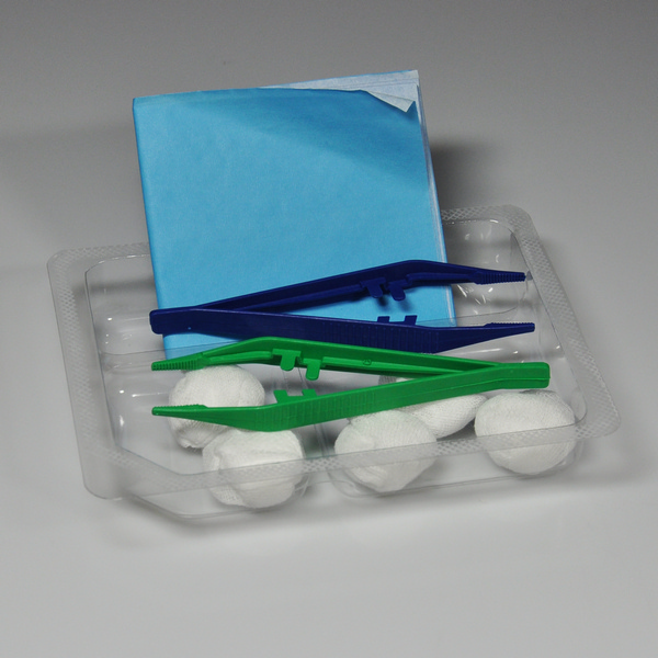 3 Kammern, 5 Kompressen, 5 Gaze-Tupfer, 2 Pinzetten, 1 Abdecktuch, 1 Karton à 44 Sets